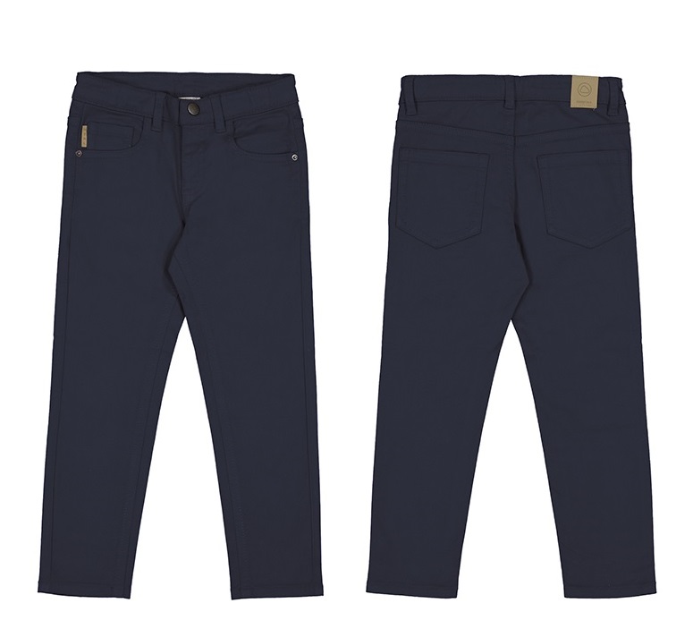 Slim fit trousers for boy which fit well to the figure. Adjustable elasticated waistband to fit the waistline perfectly. Made from comfortable and resistant twill fabric. Contains sustainable accessories. Functional pockets on the front and back of the item. For safety reasons, the smaller sizes (2-5 years) will not have a zip, instead there will be false flies.